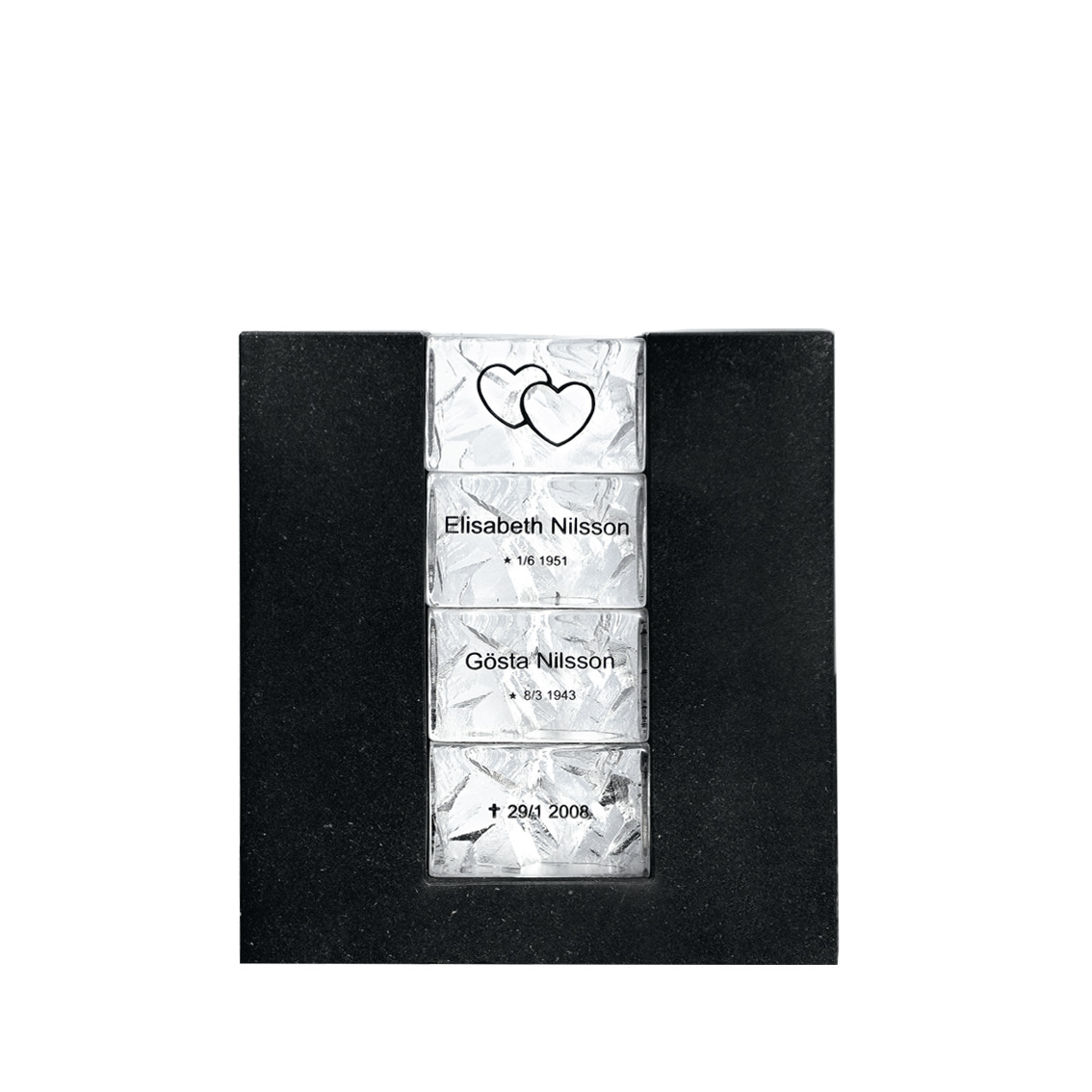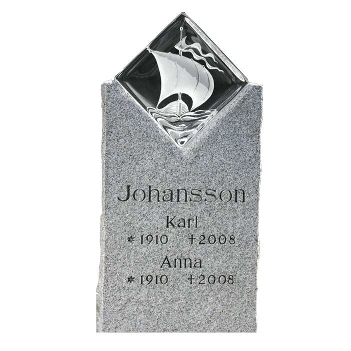 I samarbete med Målerås glasbruk har vi tagit fram en unik serie gravstenar med kristallblock. Grundmodellen var den helt raka “Trygg” men efterhand och tack vare kunders önskemål har vi gjort många olika modeller med dessa kristallblock. Blocken kan placeras nästan hur som helst – bara kundens fantasi sätter gränserna.